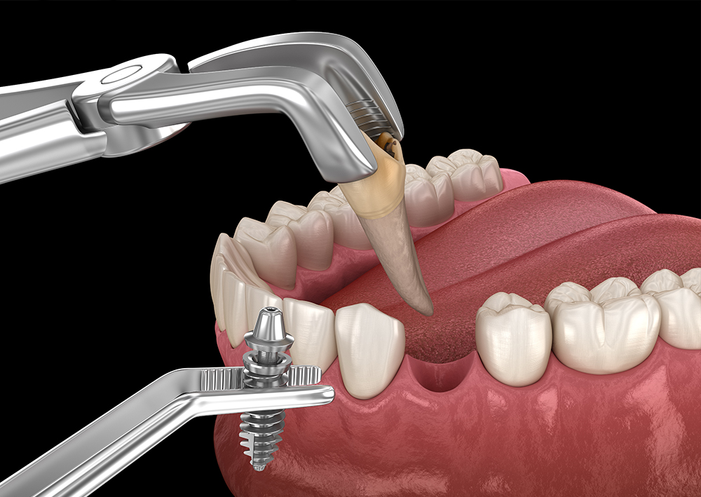 抜歯後はすぐにインプラント体を埋入し、必要に応じて骨量を補う「ソケットリフト」や「GBR法」も同時に実施します。その後、インプラント体周囲のすき間を人工骨で補填し歯ぐきを閉じ、仮歯を装着します。