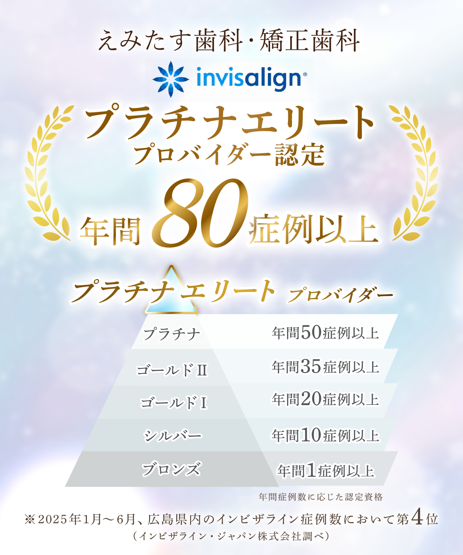 「インビザライン・プラチナエリートプロバイダー」は、年間80症例以上の治療実績を持つ歯科医師だけに与えられる特別な認定資格です。この資格を有するのは、インビザライン治療を行う歯科医師の中でもごく一部に限られます。